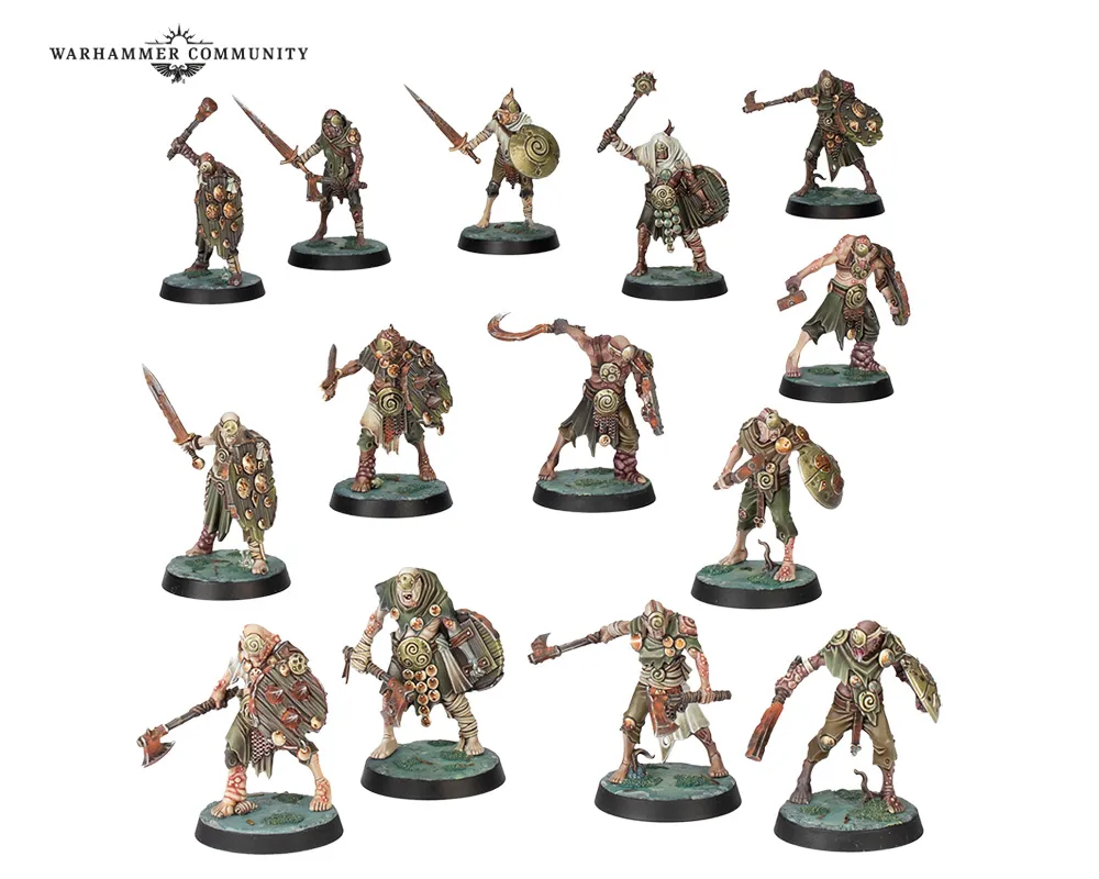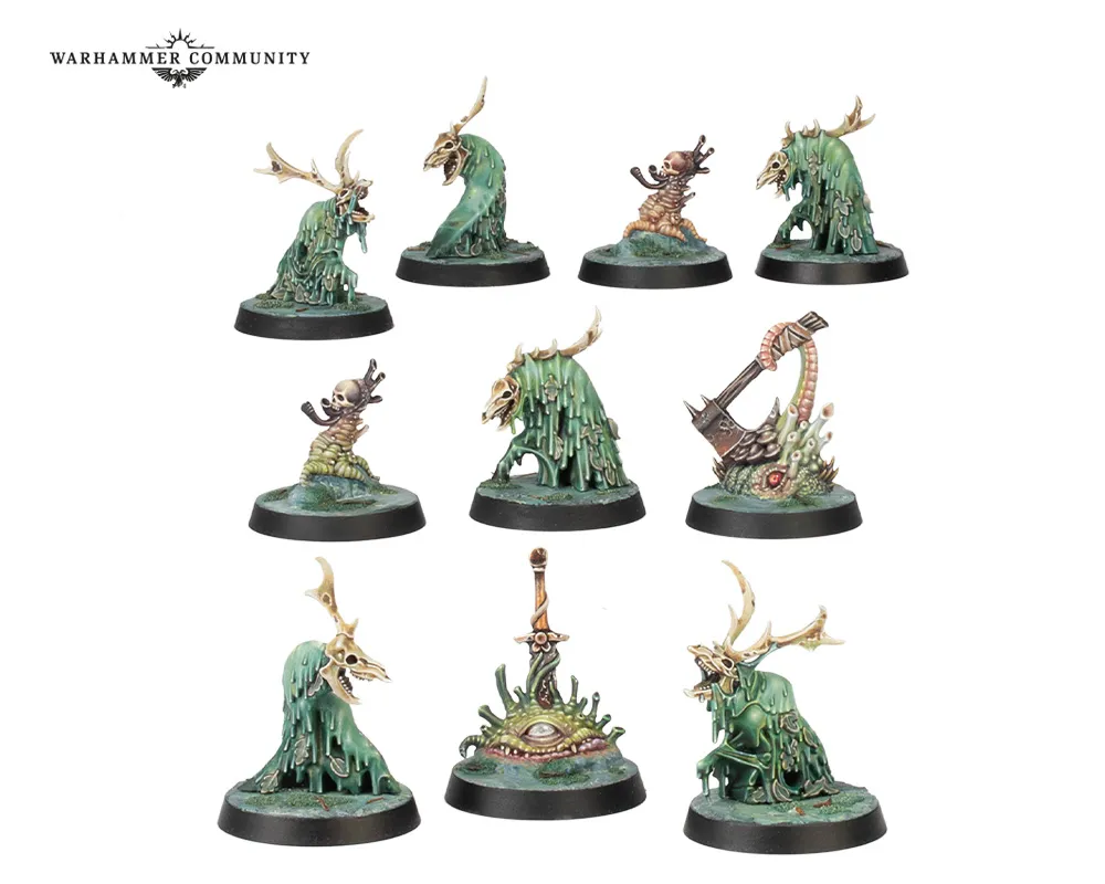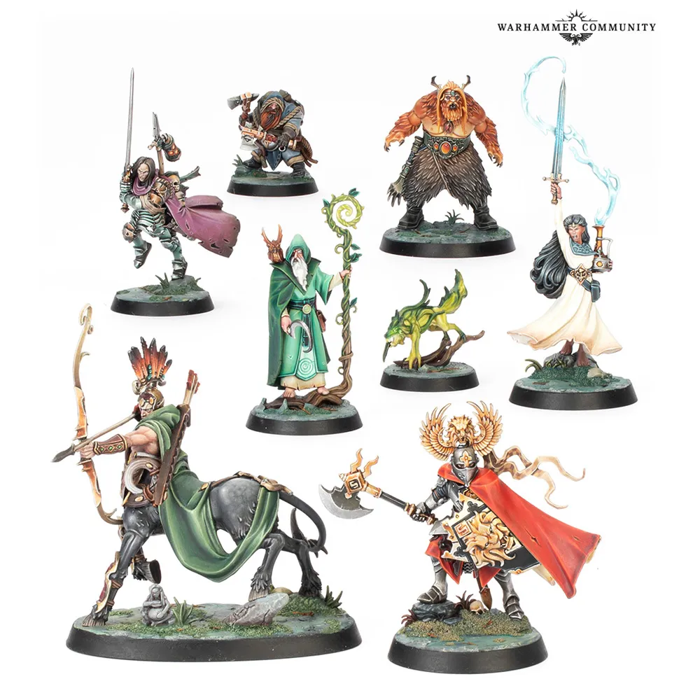 このボックスには、49体の精巧なプッシュフィット式のミニチュア——「“マンティコアの騎士” エドマーク・ヴァロラン」「“歴戦の探検家” ドロルフ・アイアンヘッド」「“まつろわぬ聖者” ブレン・タイリス」「“浄化の剣” イナーラ・サイオン」「"怒りの嵐" ドラッシャー・ヴォーン」「"森の貴公子" ケルサノール」「"翡翠の魔法使い" ヤコブス・ヴァイン」「精霊の “ウィスパー”」たち、7体の英雄一団(+精霊1体)と、「悪党の魔侯ゲルガス・パスト」「“嚢胞魔女”ベルガ」「“獄門主”ムルゴス」「呪術師ファウルフーフ」に加えて、「キャンカーボーン」2体、「ブライト・テンプラー」3体、「ペスティゴウル」8体、「ポックスレッチ」14体、「マイア・ケルピー」6体、トークン4個から構成された敵の大群も同梱されている。