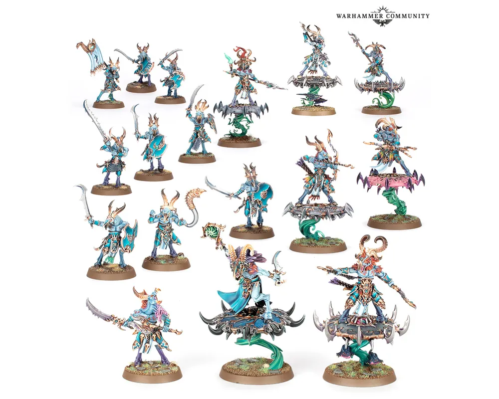 この愉快でテーマ性のある軍勢は、空飛ぶ円盤(ディスク)に乗った、素早く破壊力の高いユニットと頼もしい歩兵で構成されている。このスピアヘッドのボックスには、「ツァーンゴウル・シャーマン(ディスク・オヴ・ティーンチ騎乗)」1体、「ツァーンゴウル・スカイファイア」3体、「ツァーンゴウル・エンライテンド」3体、歩兵の「ツァーンゴウル」10体が同梱されている。さまざまな戦闘方法を持つ多種多様なユニットだ。
