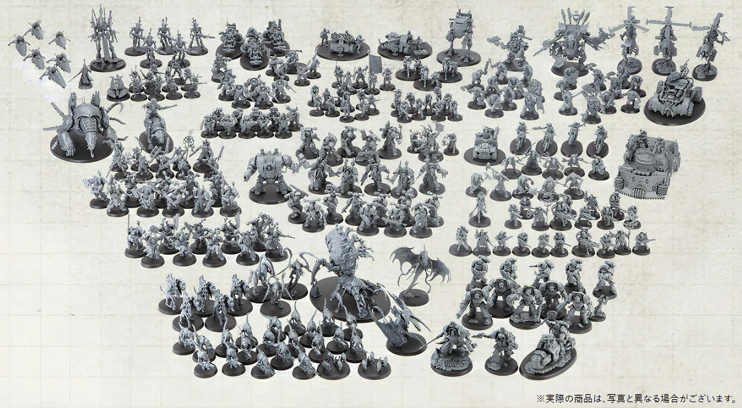 各号に精巧なミニチュア、手軽に塗れる塗料「シタデルカラー」、ブラシやゲームツール、設定資料集などがセットになっている。
