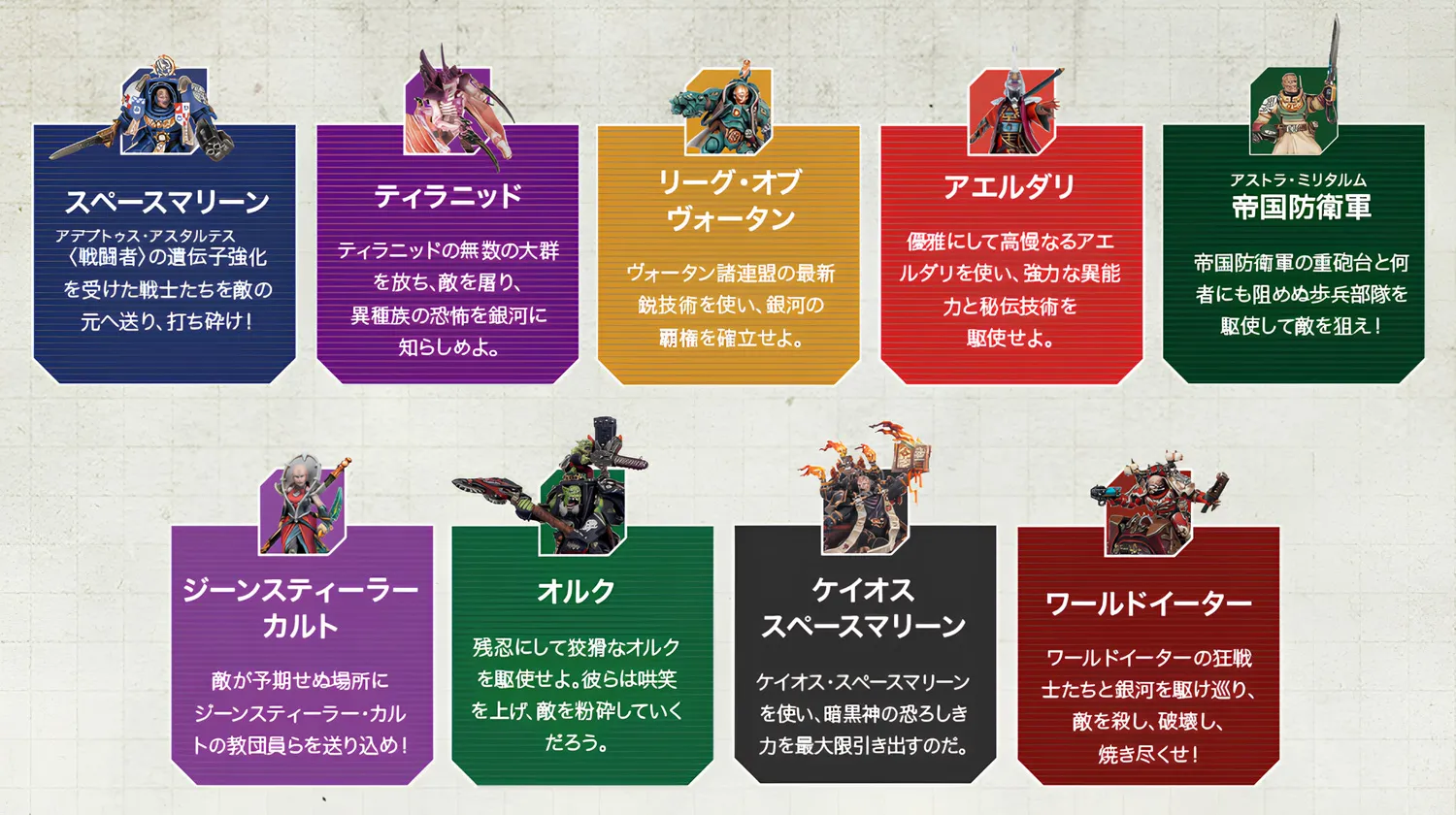 スペースマリーンほどの安定感はないが、ダークでトリッキーな動きをするバランス型の陣営だ。