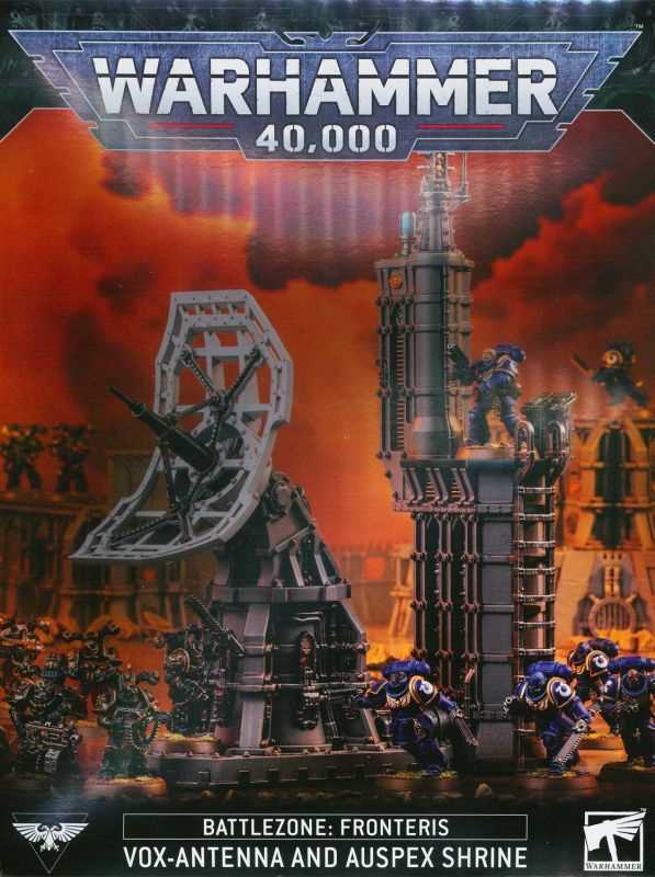 ゲーム「ウォーハンマー40,000」の戦場を再現する情景モデル2点入り(ヴォクスアンテナ1点、探兆聖壇1点)。