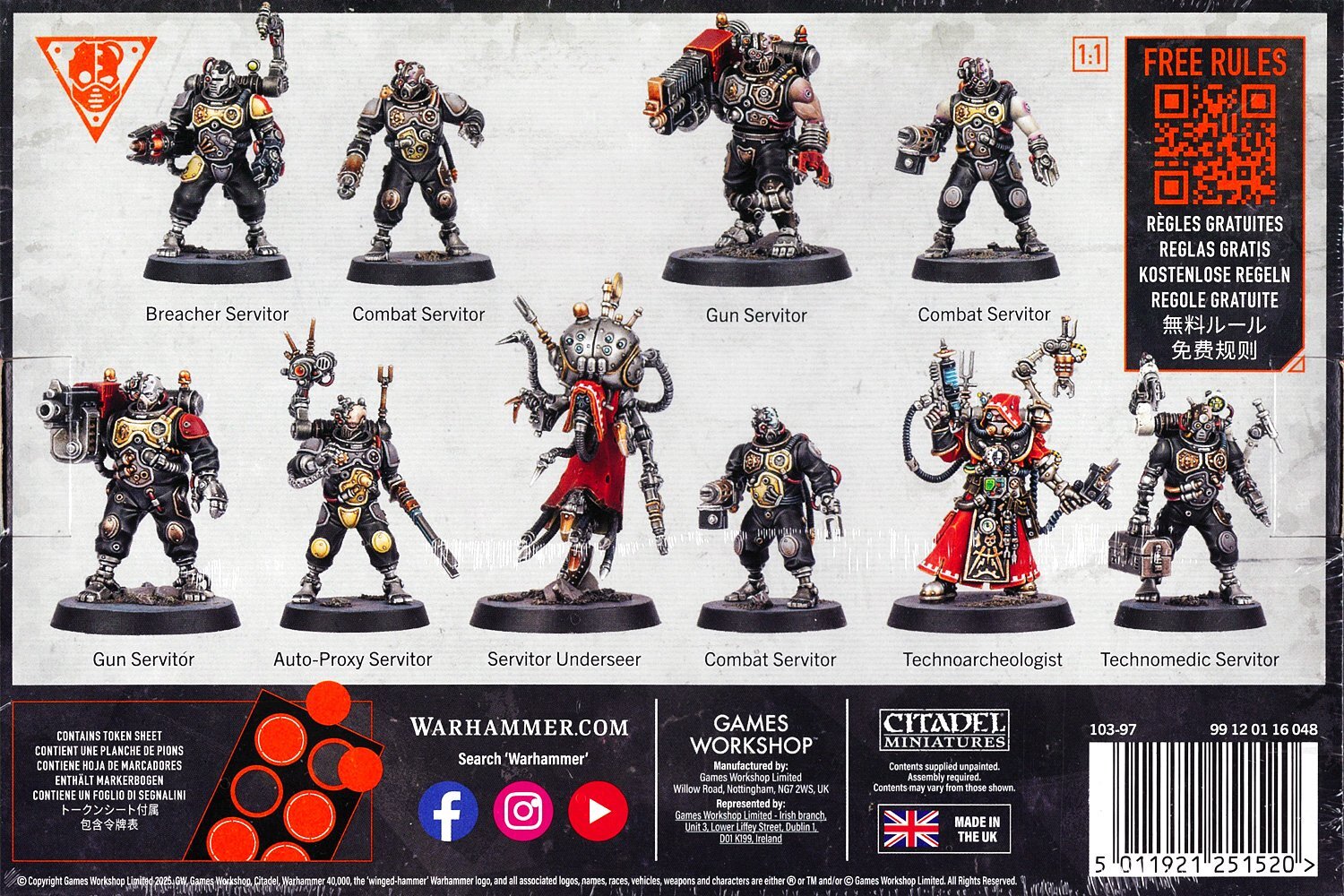 ゲームでは『キルチーム』の精鋭オペラティヴとして運用できるほか、『ウォーハンマー40,000』ではアデプトゥス・メカニカスの一部として編成可能。戦闘中の装備や効果管理に便利な**両面印刷トークン(39枚)**も付属します。