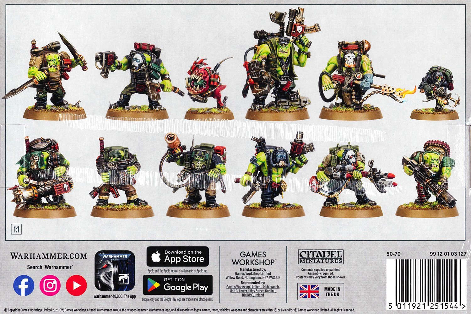このマルチパーツ・プラスチックキットは、コマンド12体を組み立てられる。『ウォーハンマー40,000』のゲームであなたのオルク軍に編入可能な、ずる賢い潜入要員だ。他の多くのオルクと違い、彼らは隠密で敵へ接近し、冷酷に切り倒す――それは狡猾(だが残忍)なウォーロードに新たな戦術オプションを与える。この高いカスタマイズ性を持つキットでは、スラッガ&チョッパで武装したコマンド9体とボス・ノブに加え、ボム・スクイグとおとり役のグロット(ディストラクション・グロット)を構築できる。弾薬ポーチ、グレネード、鞘入りナイフ、ホルスター入り武器など豊富な追加パーツに加え、一部のコマンドには頭部オプションも付属する。