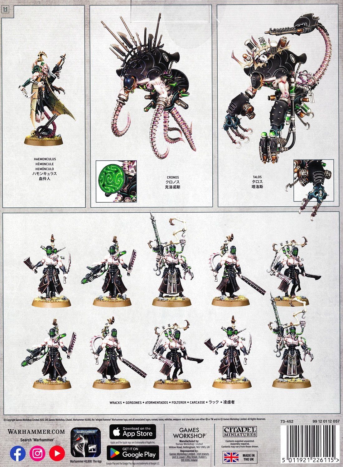 このボックスは、新たにデュカーリを始める方にも、既存の軍勢を拡張する方にも最適。個別購入よりお得に揃えられるセットだ。ヘモンクルスに率いられた残虐なレイス、そして重火力を誇るクロノスとタロスが、無防備な敵を襲撃し苦痛を撒き散らす。これら13体のプラスチックミニチュアは、「苦痛のコヴン」としてコンバットパトロール戦でそのまま使用可能。