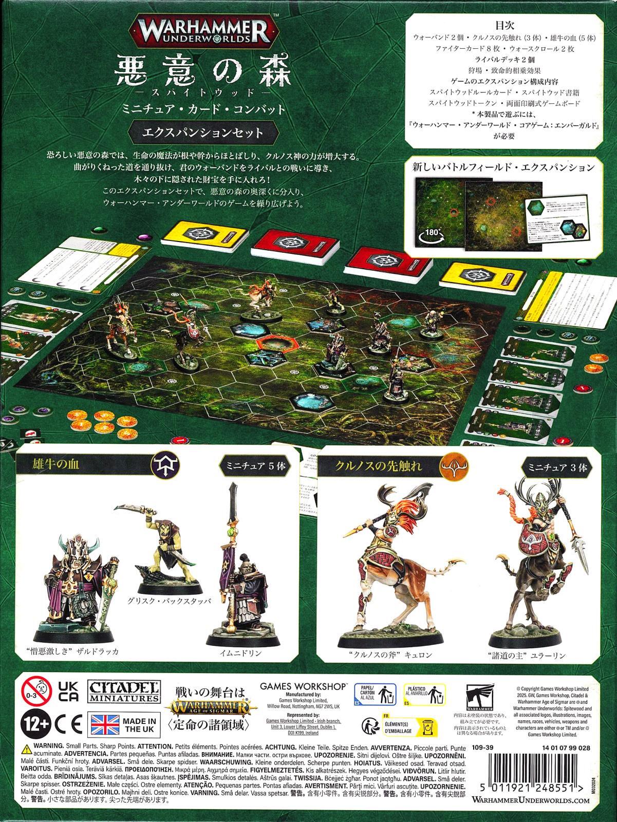 本拡張セットは、アンダーワールドの舞台を迷宮のような森「スパイトウッド」へと広げます。野心的な渾沌の神の信徒たちと、シルヴァネスの狩人たちが激突する地です。両面仕様のゲームボードには新たなゲーム要素――癒しの「アクア・ギラニス」と守護の「ウェイストーン・ヘクス」が登場。さらに2つのウォーバンド「ブラッド・オヴ・ザ・ブル」と「クルノスの使徒」に加え、それらを最大限活用できるライバルデッキ(ストライクデッキ/マスタリーデッキ)、各種トークンやファイターカード、ウォースクロールカードも同梱されています。