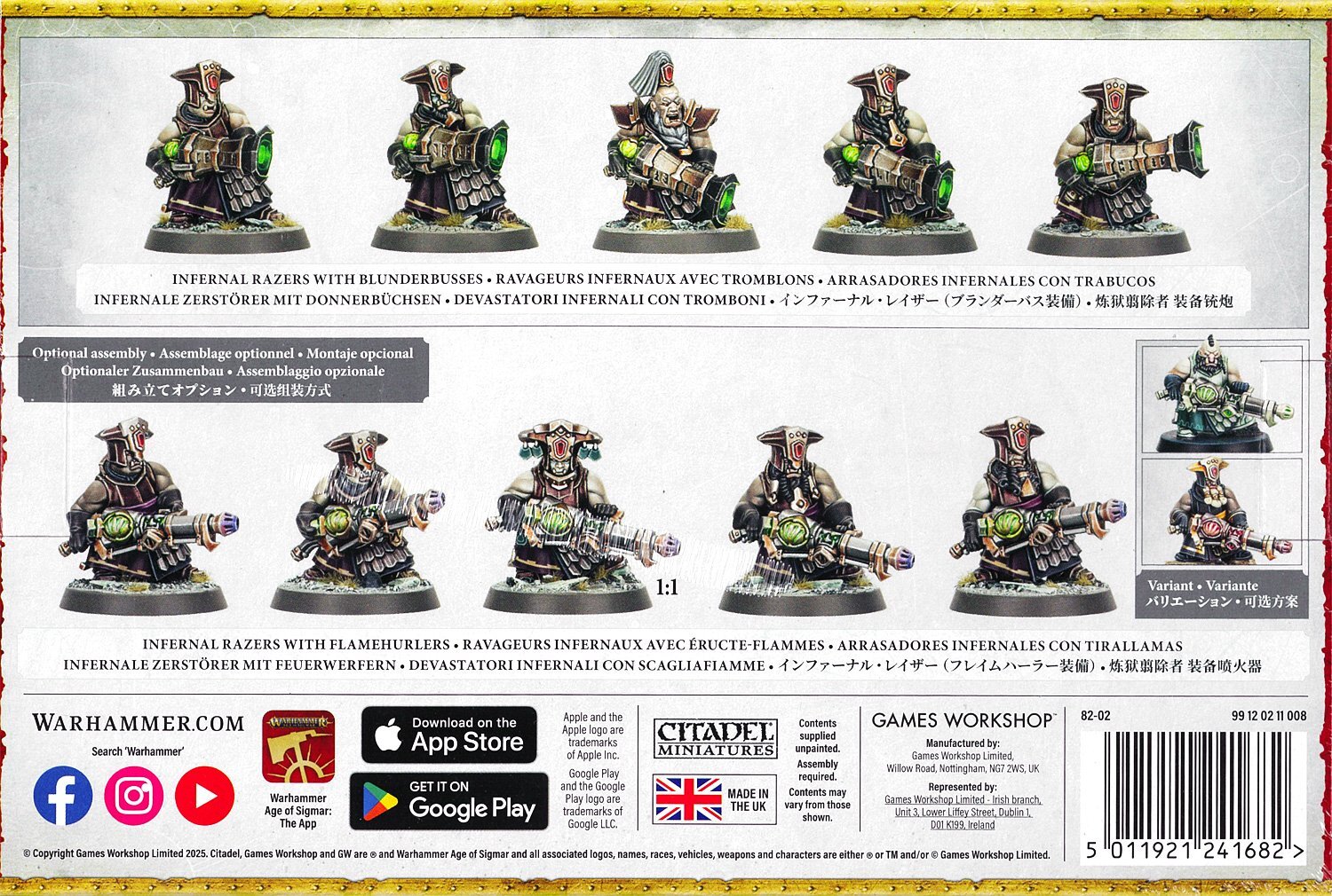 このマルチパーツ・プラスチックキットには、インファーナル・レイザー5体を組み立てることができます。彼らは『ウォーハンマー:エイジ・オヴ・シグマー』におけるヘルスミス・オヴ・ハシュット軍の重火力歩兵として活躍します。厚い装甲をまとい、破滅的な威力を誇るグリズマロク・ブランダーバスや、歩兵を焼き尽くすカラグスルン・フレイムハーラーを携え、重要拠点の防衛にも長距離攻撃にも対応可能です。