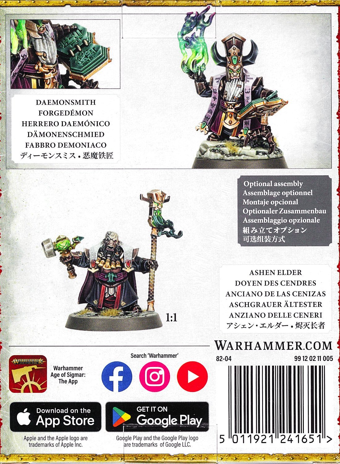 このマルチパーツ・プラスチックキットでは、『ウォーハンマー:エイジ・オヴ・シグマー』においてヘルスミス・オヴ・ハシュット軍のために戦うディーモンスミス1体を組み立てることができます。富と権勢の象徴を身にまとい、黒鉄の鉤爪を掲げて立つその姿はまさに威厳に満ちています。彼はその鉤爪から邪悪な魔力を放ち、敵を灼き滅ぼすだけでなく、ハシュットの戦争機械を駆動させる悪魔炉に魔力を注ぎ込みます。