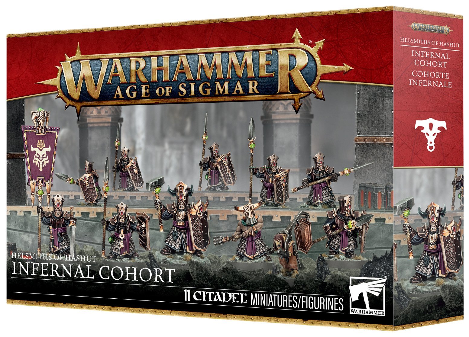 このマルチパーツ・プラスチックキットでは、『ウォーハンマー:エイジ・オヴ・シグマー』においてヘルスミス・オヴ・ハシュット軍の歩兵部隊インファーナル・コホート10体と、その行軍を支える銅鑼を運ぶホブグロット1体を組み立てることができます。