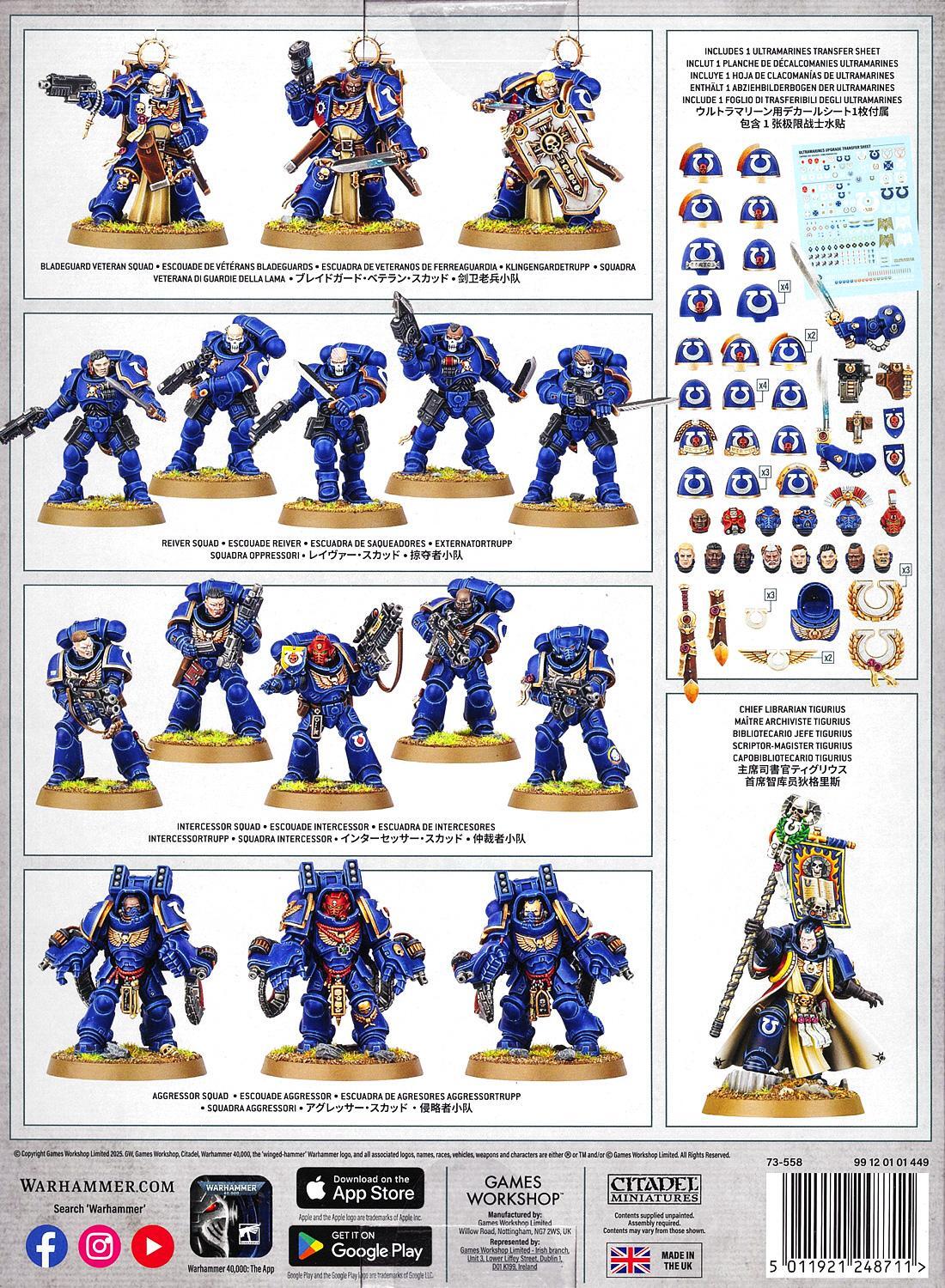 もしあなたが「帝国を守り、かつ規範に則って戦いたい」と望むなら、この箱は新たにウルトラマリーンを始めるにも、 既存の軍勢を拡張するにも最適で、単品購入に比べてお得です。戦団で最強のサイカーたるチーフ・ライブラリアン:ティグリウスが軍勢を率い、あらゆる状況で力を発揮する万能の戦士として活躍します。 護衛にはブレイドガード・ベテラン。アグレッサーは強力な射撃支援を行い、接近戦も厭いません。 高い機動力を持つレイヴァーは脆弱な目標の確保や敵部隊の攪乱に長けます。 インターセッサー・スカッドは戦列歩兵として戦線の穴を埋め、重要目標を保持しつつ火力を供給します。 本セットの17体のプラ製ミニチュアは、『ウォーハンマー40,000』のタイトで戦術的な コンバットパトロール戦にそのまま投入できる完全なウルトラマリーン部隊を構成します。 本コンバットパトロールのルールはWarhammer Communityにて無料ダウンロードが可能です。
